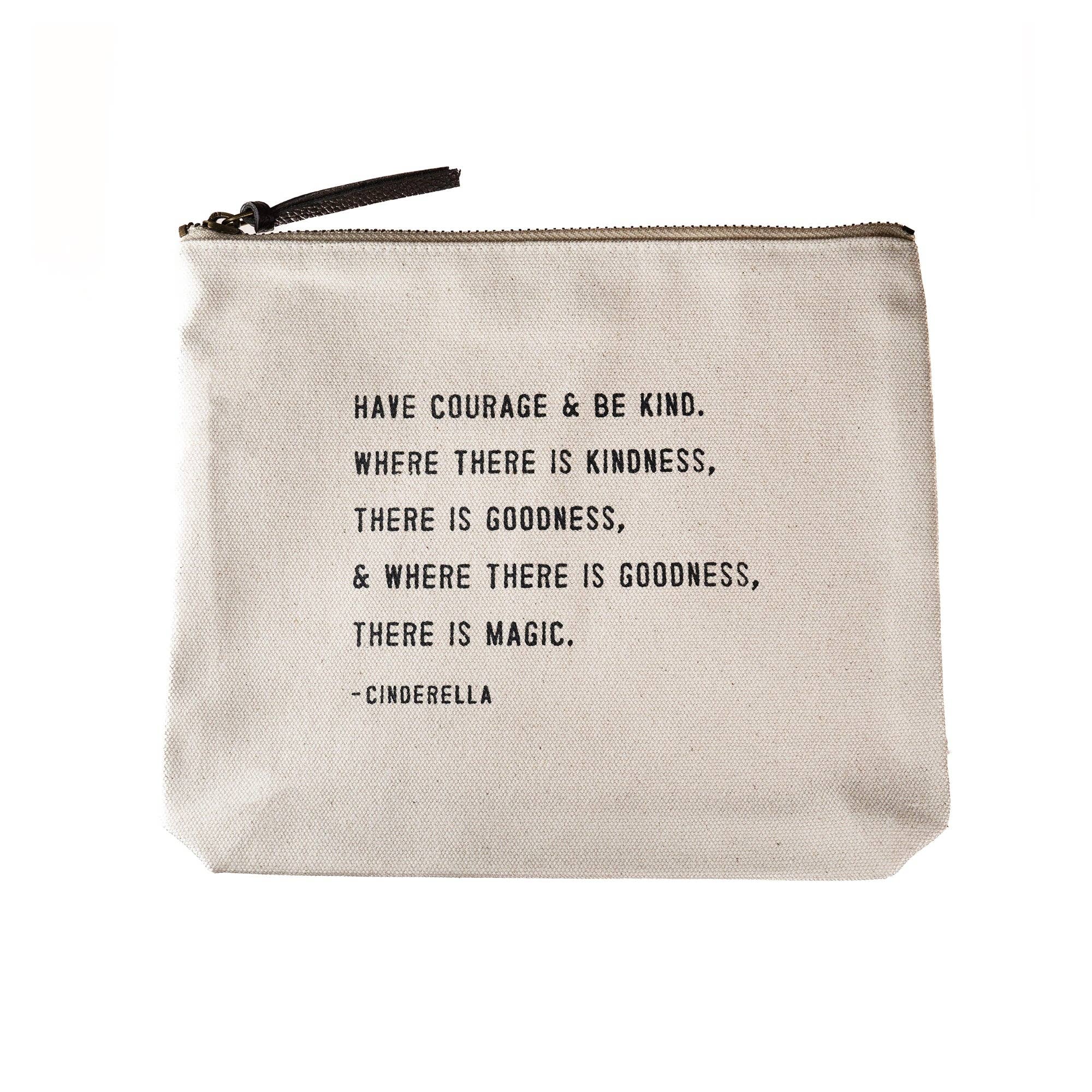 The Sugarboo & Co Small Zip Pouches are perfect for organizing small items in your daily life. The durable fabric is held with a leather zipper tab and decorated with inspirational quotes for your organizing needs. Keep everything in your purse or bag organized with these canvas zippered pouches so you never lose anything again. Whether you plan to use these bags for travel organization or as a canvas makeup bag, we know you’ll find the perfect pouch and quote for you. A note from the artist: These canvas cuties are the ultimate for your bag of tricks! Perfect for makeup, pencils, accessories, and happy things. Pro-tip: it’s the perfect low-maintenance gift wrap for a gift or for bridal and party favors. Details: * Quote: Have courage & be kind. Where there is kindness, there is goodness, & where there is goodness, there is magic. - Cinderella * Canvas pouches * Zipper closure * 9" x 7"