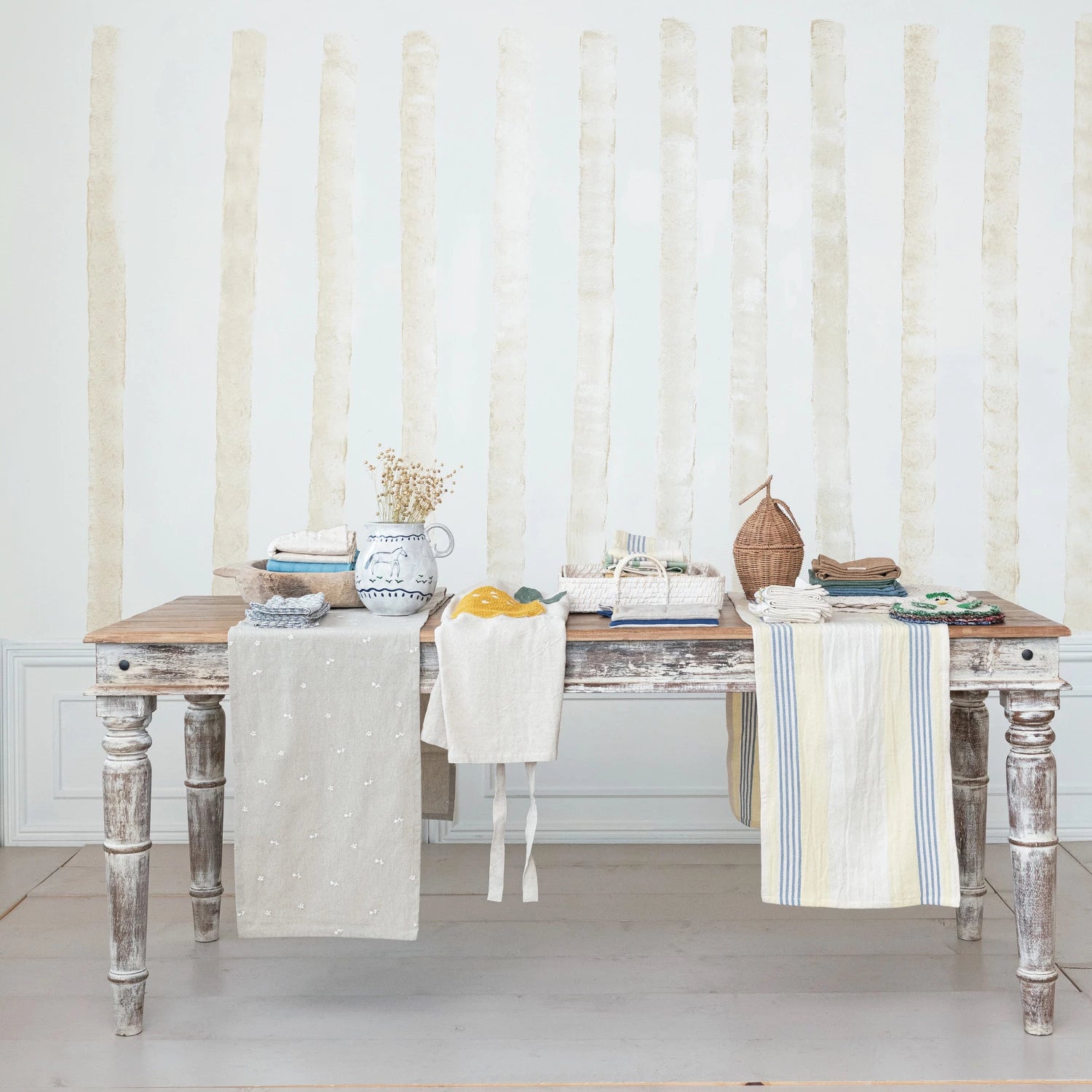 Cotton Table Runner w/ Embroidered Flowers, Natural & White
