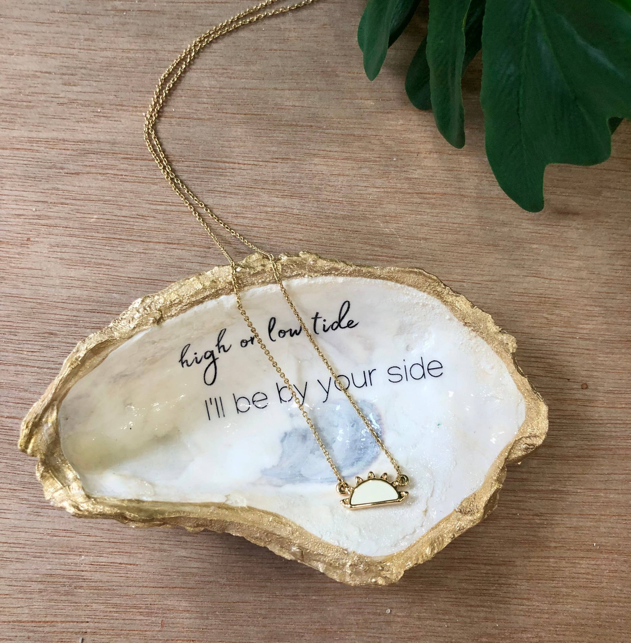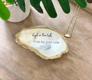 Our oyster shells are harvested, cleaned and hand crafted to create unique jewelry and trinket dishes. Each shell is one of a kind! All of our oyster dishes have been individually hand selected and embellished. These one-of-a-kind creations are not mass produced in a factory and as a result, each shell dish will have subtle variations from one another. Beautiful variations are due to hand gilding, the unique natural variations in the shape and size and resting angle of the seashells. While the size of our shells does vary, all are a minimum of three inches long.
