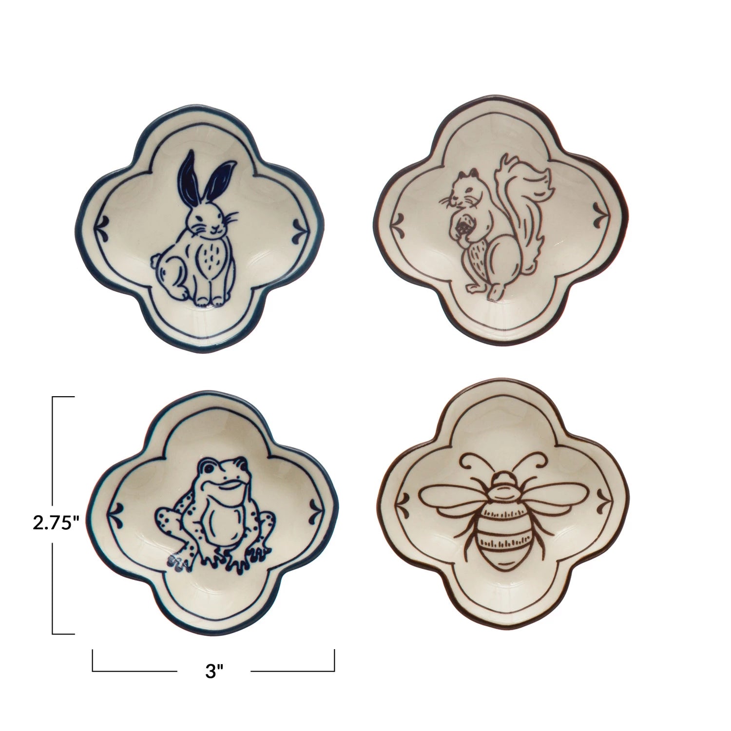 Stoneware dish with animal or insect. Available in 2 colors and 4 styles.