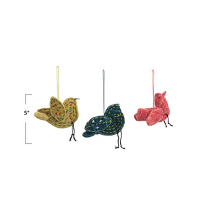 Cotton Velvet Bird Ornament with Kantha Stitch - 3 Colors