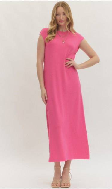 Solid cap sleeve long dress featuring extended shoulder design. Pink