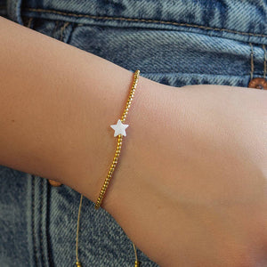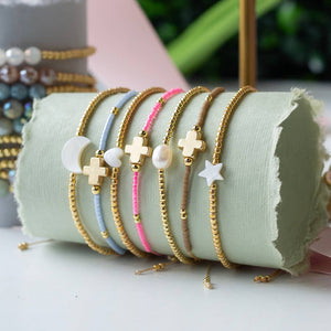 Delight your customers with the Intentions Collection, a heartfelt addition to your boutique. Each adjustable cord bracelet is designed to fit everyone, featuring delicate 3mm gold-plated beads paired with a mother-of-pearl symbol in one of six meaningful designs: star, moon, heart, cross, pearl, and daisy.