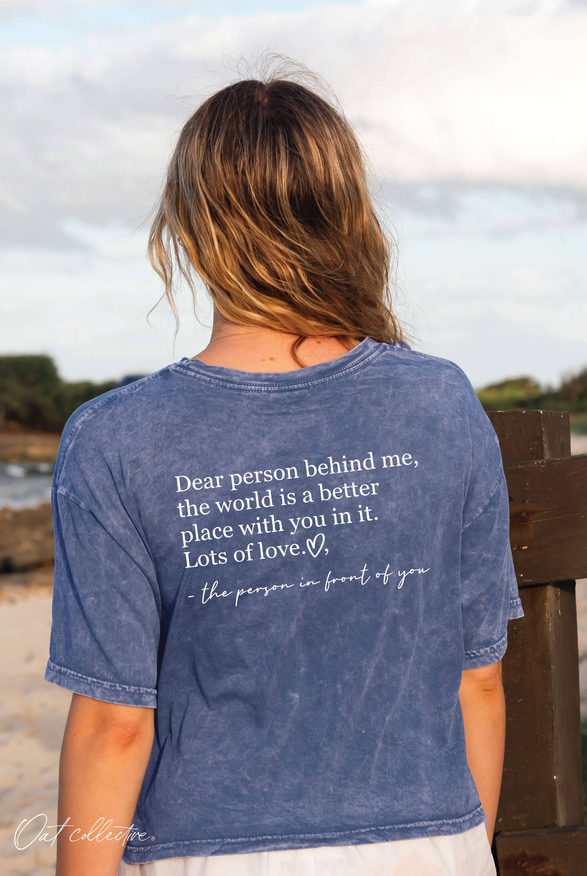 Back-Dear person behind me,the world is a better place with you in it. Lots of Love.-the person in front of you. Front -be kind Cropped Mineral Washed Graphic Top -100% Premium Cotton Jersey. -Relaxed Cropped Fit. -Screen Printed with water based ink. -All items are slightly different because of the dying process of the garment. -
