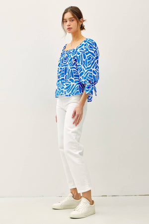 BREEZY, PRINTED 3/4 SLEEVE TOP W/ ELASTIC NECKLINE & TIE DETAILS ON SLEEVES