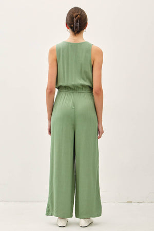 BUTTON UP V-NECK JUMPSUIT W/ WIDE, FLOWY LEG & DRAWSTRING WAIST