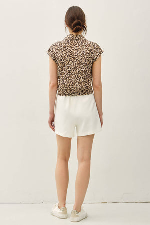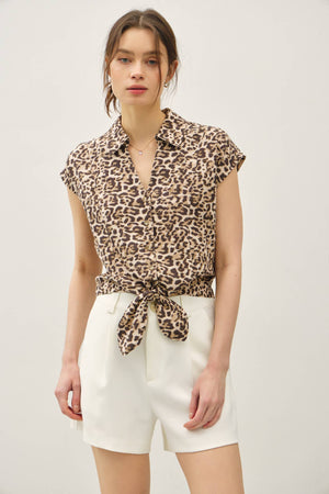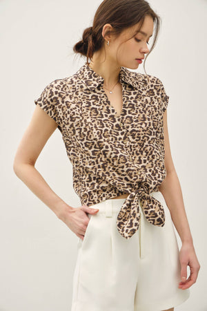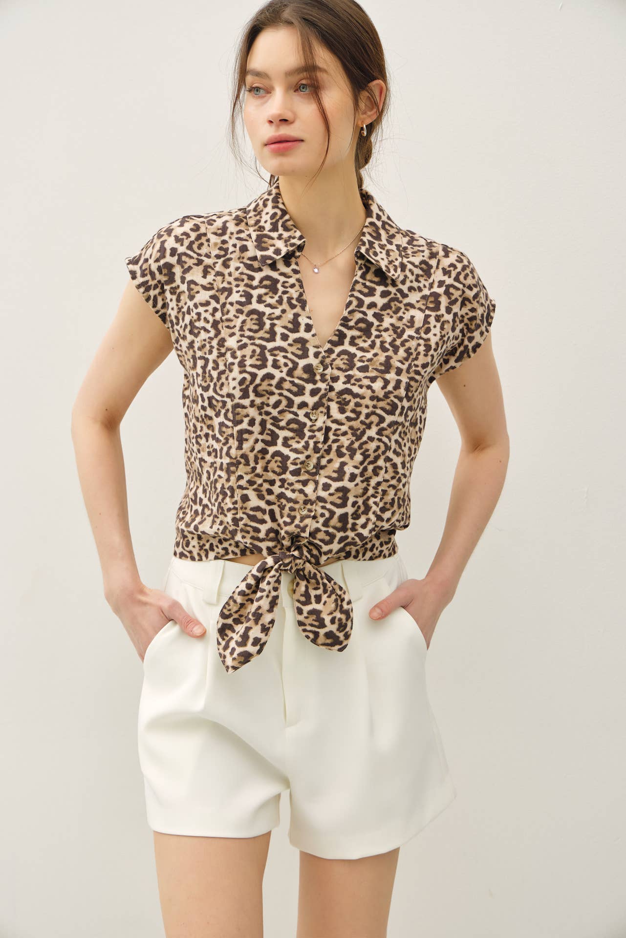 LEOPARD PRINT CAP SLEEVE BUTTON UP COLLARED TOP W/ TIE DETAIL AT HEMLINE