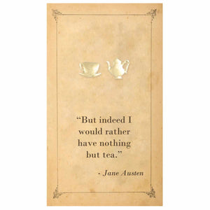 The famous quote, "But indeed I would rather have nothing but tea." inspired this vintage pair of gold tea set post earrings. The shiny gold teapot and teacup stud earrings are displayed on a vintage parchment card printed with Jane Austen's legendary quote. * Made in China * Carded gold tea set post earrings make a great gift for lovers of classic literature * Measures: 3/8" * Materials: Gold Tone Metal, Stainless Steel Post
