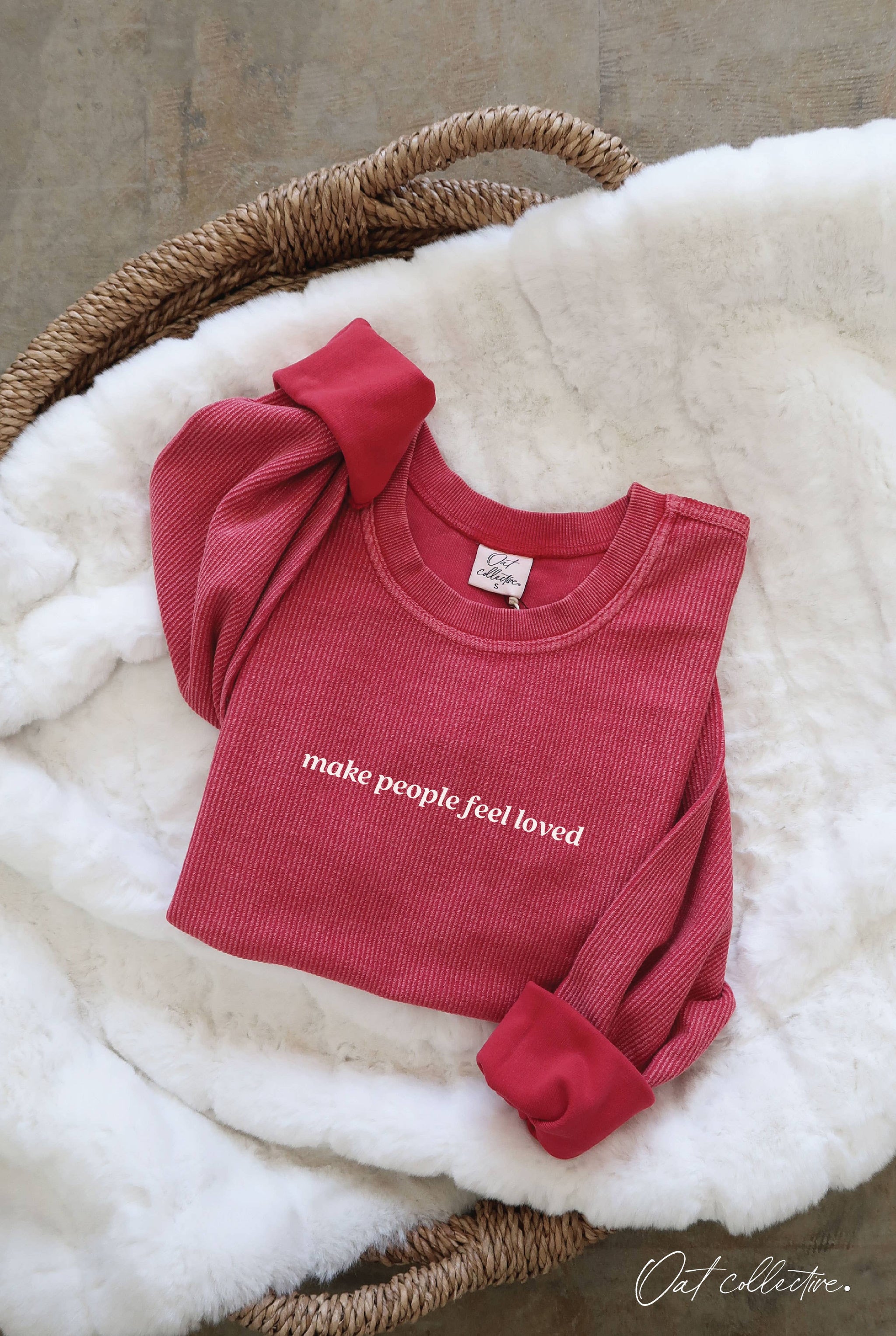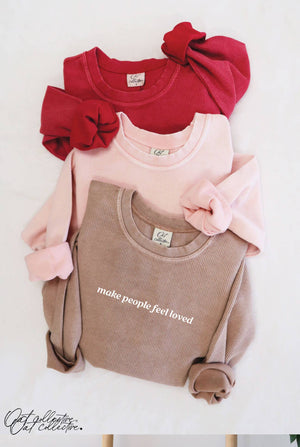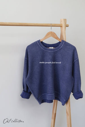 MAKE PEOPLE FEEL LOVED Cropped Thermal Vintage Pullover Oversized sweatshirt with a super soft, vintage wash corded fabric. -Mid Cropped Length. -Designed with a relaxed Oversized Boxy Fit. -Classic Crew neck style. -Finished with ribbed cuffs and waistband for a clean, modern silhouette. -Due to the dye process, each piece has its own unique vibe-no two are exactly alike. -Each piece is hand-printed with High Quality Ink. -Exclusive Oat Collective Main Label. -Fabric content: 100% Cotton. -Category-LOVE