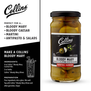 Give your Bloody Mary a kick with Collins' double stuffed jalapeno and garlic olives. Made from genuine Spanish Queen Olives stuffed with jalapeno and garlic, these delicious olives make a great garnish or snack.