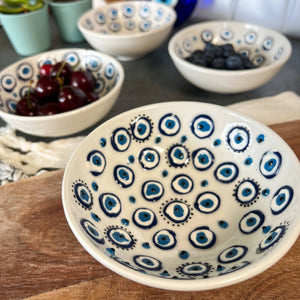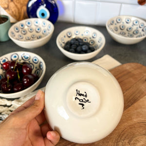 These cute ceramic bowls are handmade in Turkey. These bowls are 4" wide.