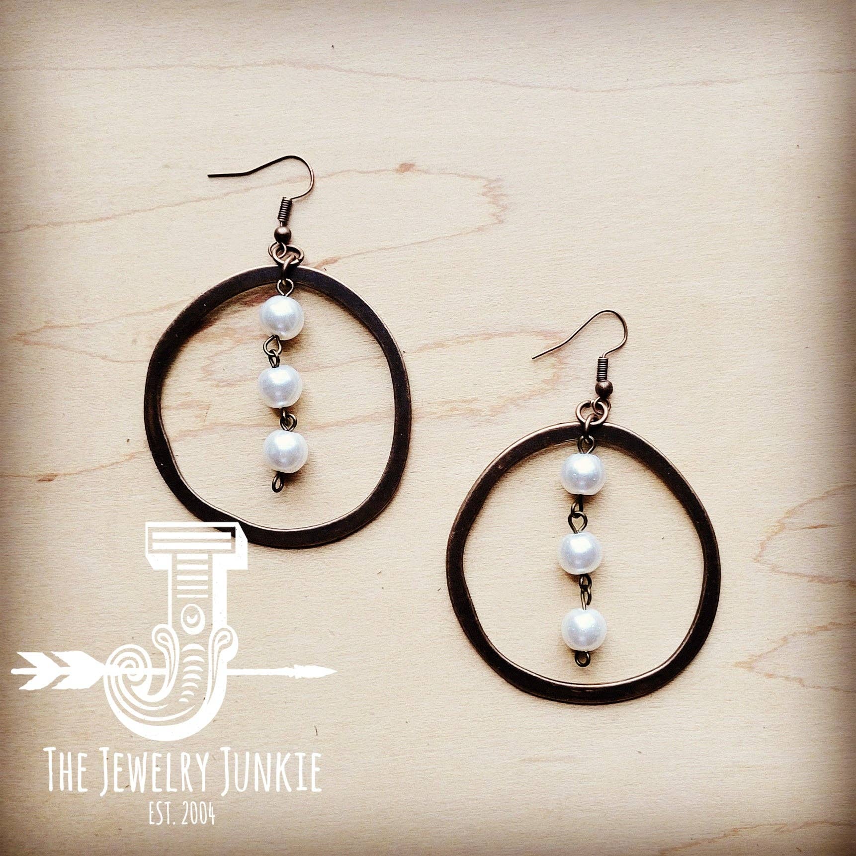 These stylish Copper Hoop Earrings feature glass pearl beads for a unique western-inspired look. Crafted with high-quality materials, the durable hoops and beads guarantee long-lasting wear. Add a touch of boho flair to any outfit. Entire length is approx. 2"