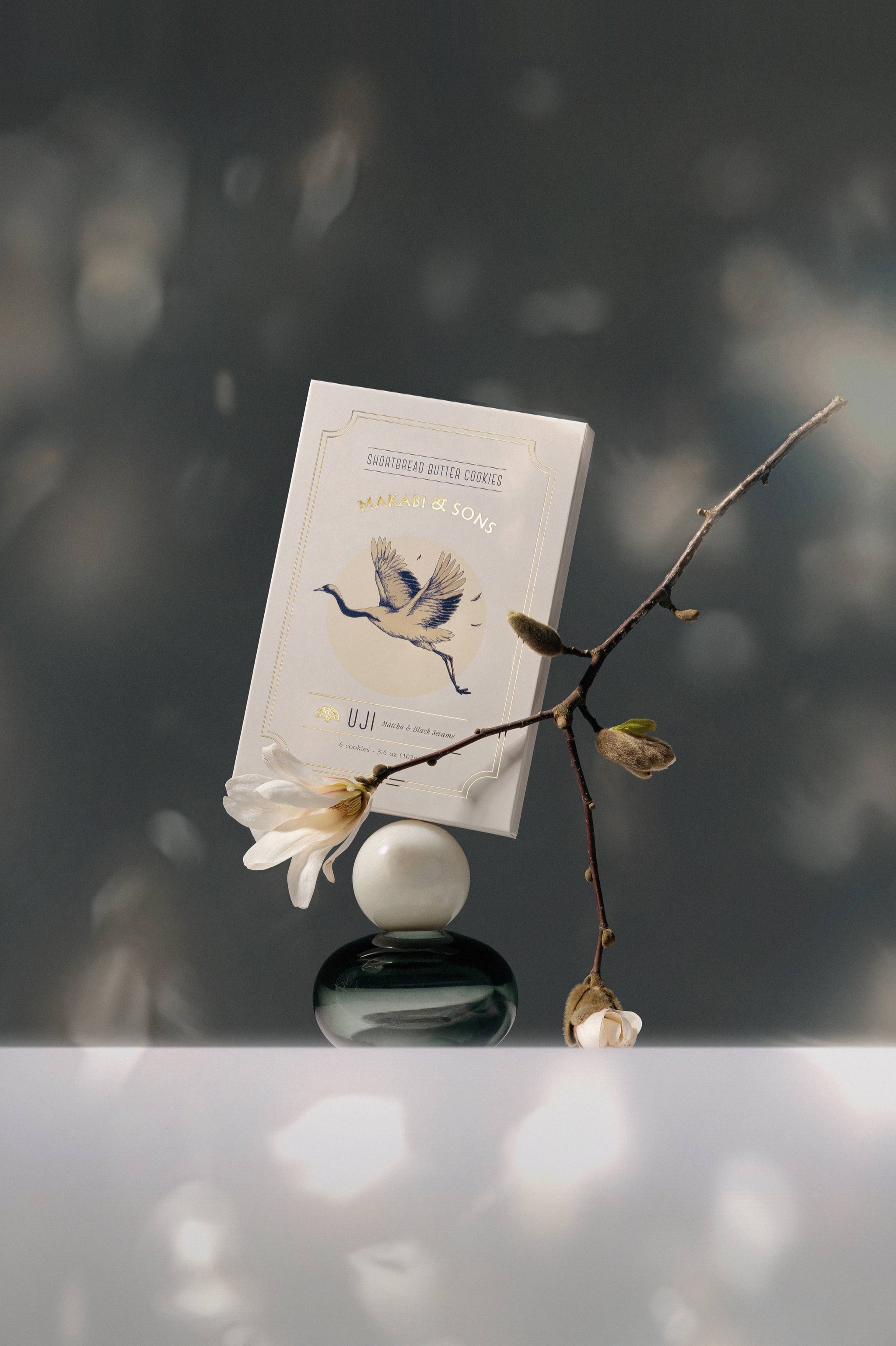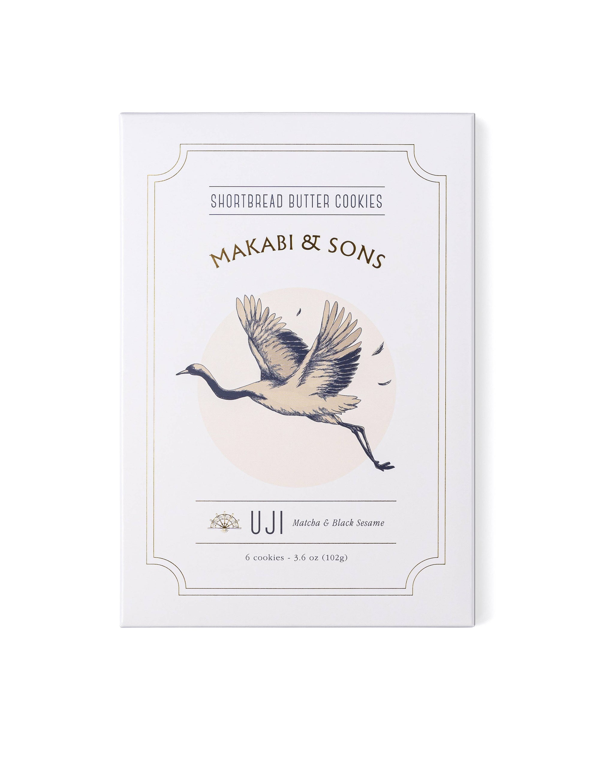 Shortbread butter cookies with rich matcha green tea and toasted black sesame seeds. Delicate gestures performed in a secluded Japanese tea house. A remote teahouse along the banks of river Kamo welcomes peace. Lasting matcha is met by the earthy richness of sesame. Indulgent awareness awaits. 3.6oz (6 cookies per box) Minimum 4 Month Shelf Life.