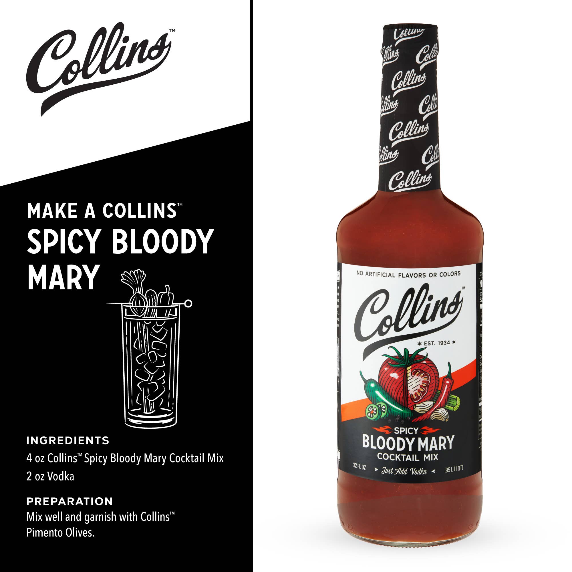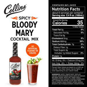 Make your next brunch a spicy one! Collins Spicy Bloody Mary Mix makes this popular cocktail a breeze with a rejuvenating blend of natural ingredients like tomato, garlic, Worcestershire sauce and an extra kick of spices to awaken the senses. Just add vodka for a delicious cocktail at home.