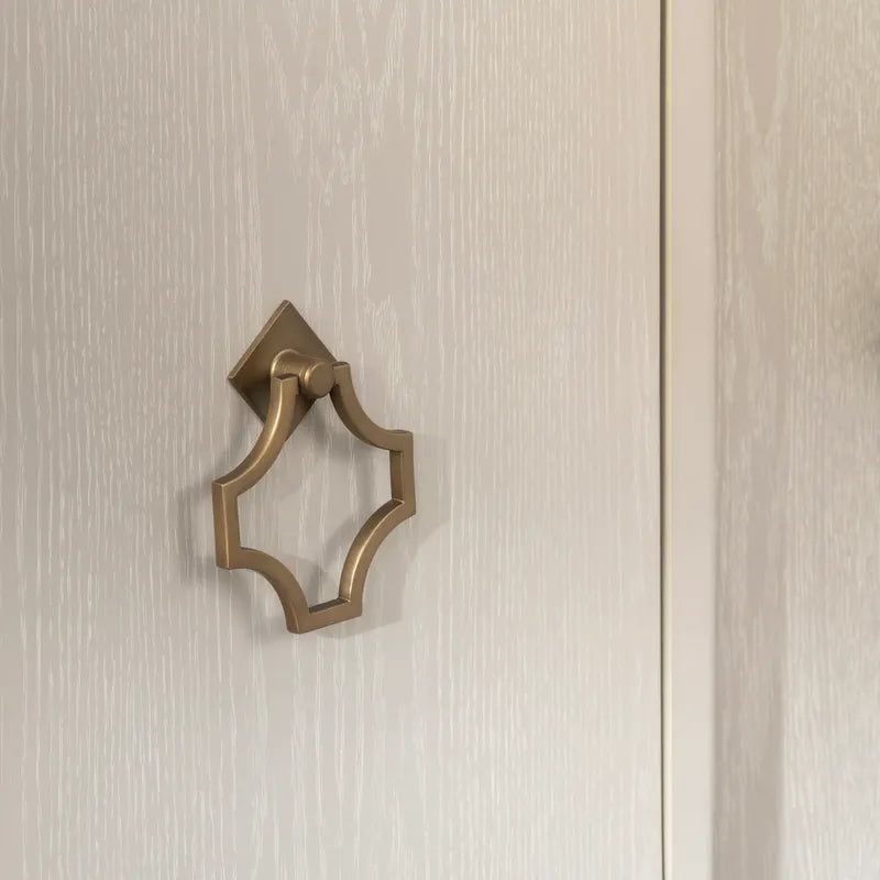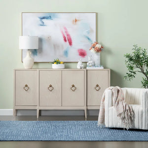 Bring charm into your home with this attractive 4 door media credenza / sideboard featuring a breakfront design. The beige finish with yellow undertones brings out the natural wood grain pattern, and the matte gold geometric shaped hardware completes the modern but classic look. Inside, you will find European Hinges on the doors, magnetic closures, 2 cord management holes and 3 fixed shelves.