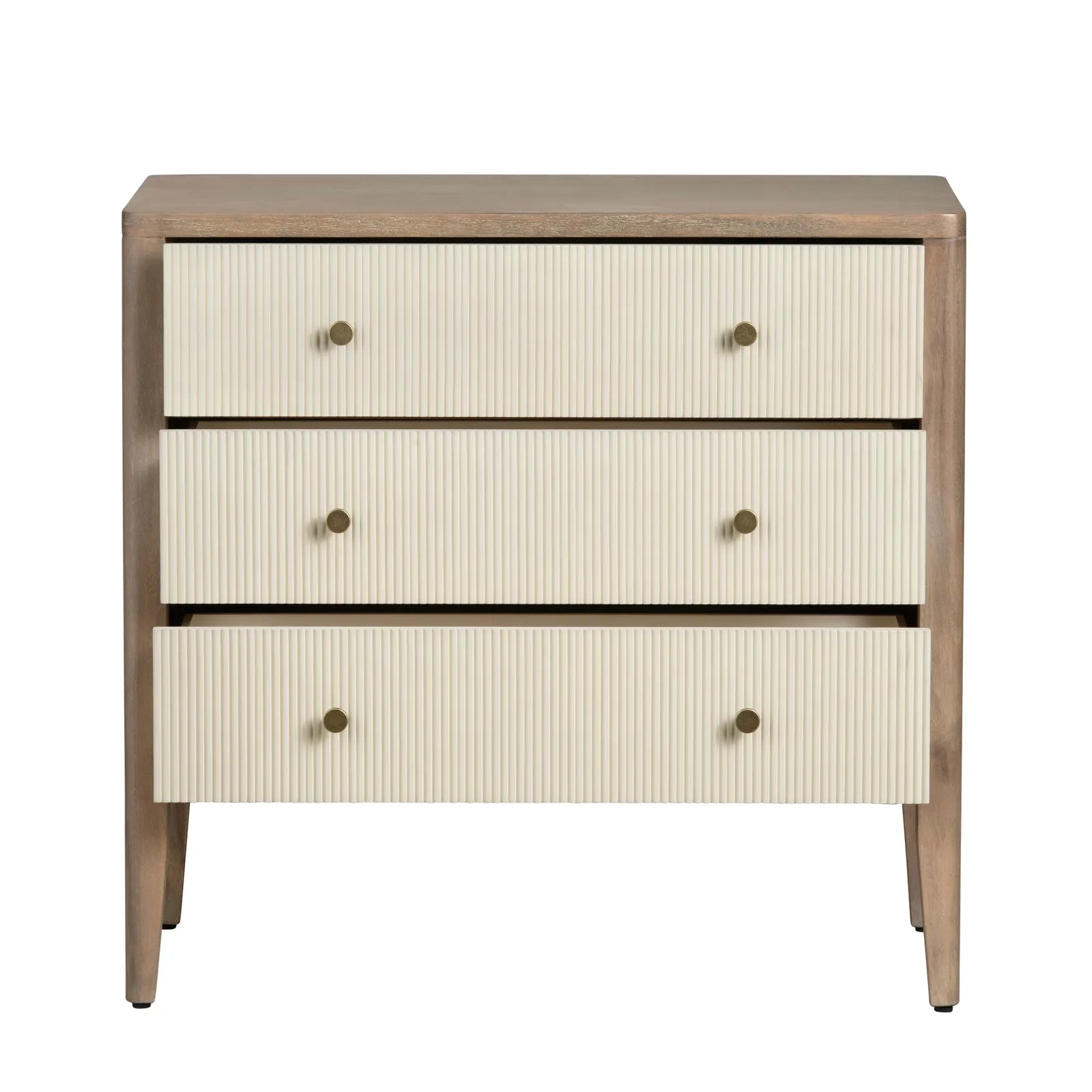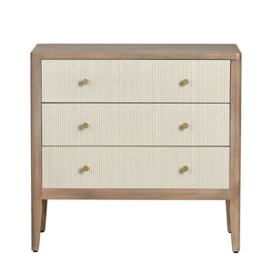 This three-drawer chest measures 33.5 x 17 x 32 inches and showcases a warm brown frame with a natural wood grain finish complemented by cream doors featuring a subtle yellow undertone, offering a classic and elegant look. It includes enhanced European hinges, two fixed internal shelves, and adjustable levelers for stability and convenience. Designed with two cord management holes and delivered fully assembled, it provides both style and practicality, making it an effortless upgrade to your living space. Renew your décor with this expertly crafted piece.