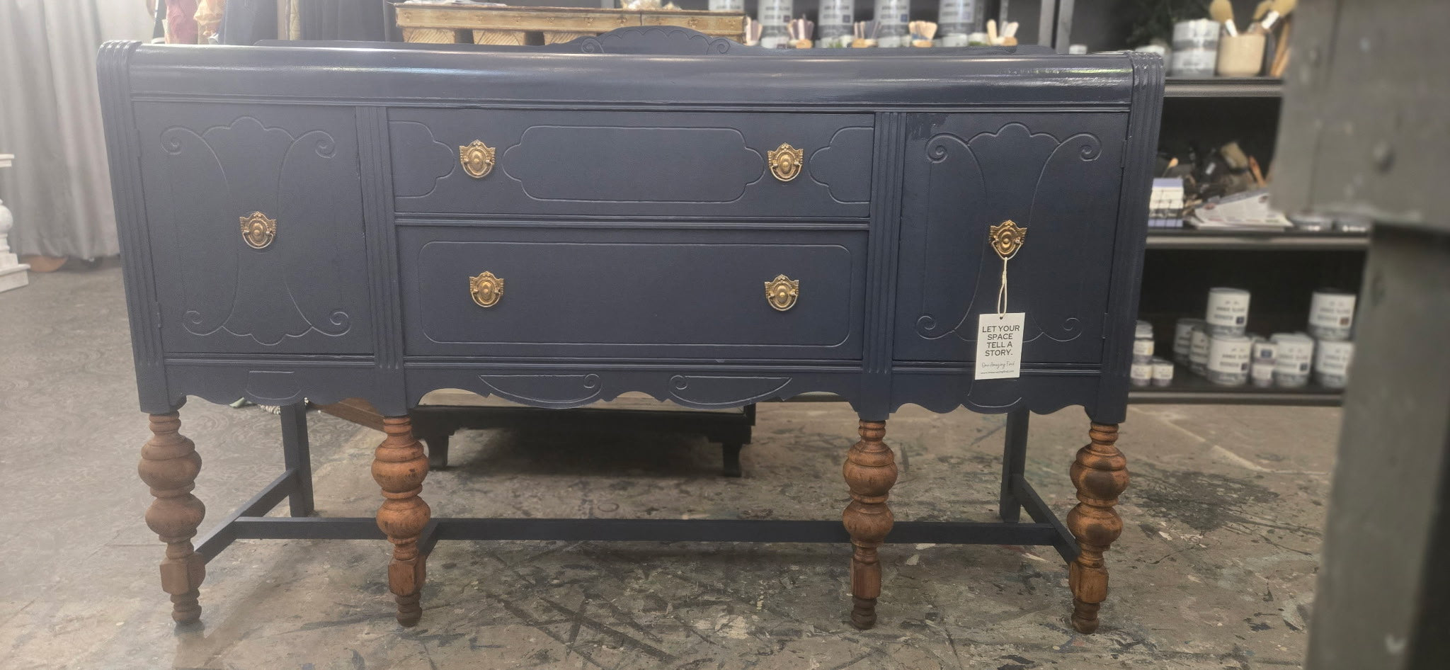 This stunning vintage buffet is expertly hand painted in Oxford Navy. Its dimensions are 60" wide, 19" deep, and 26" high.