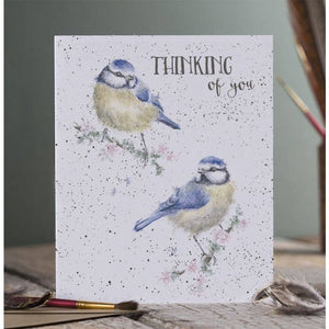 Show someone they're in your thoughts with this card which features two lovely blue tits and says 'Thinking of you.' The card is printed on beautiful textured, sustainably sourced board and is supplied wrapped with a recycled kraft envelope. It measures 6.77 x 4.84 inches. Message inside reads 'with love.'