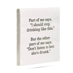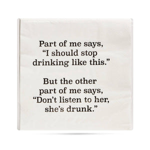 KEYWORDS: Part of me says I should stop drinking like this, but the other part of me says don't listen to her she's drunk Cocktail Napkins, cocktailing, drinking with friends, girls night, hostess gifts, hosting parties, kitchen gifts for entertaining, kitchen accessories, bar decor, entertaining, bff gifts, funny cocktail napkins, girls night, bestie gifts, printed napkins, napkins, funny sayings, snarky gifts, best birthday gifts, gifts for coworkers, disposable napkins, sassy napkins, snarky napkins
