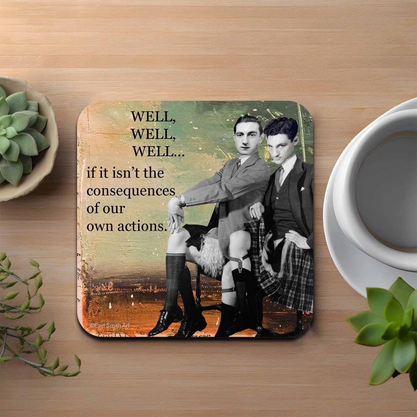 Our coasters are made in the USA from absorbent, neoprene-like material and measure 4" x 4".