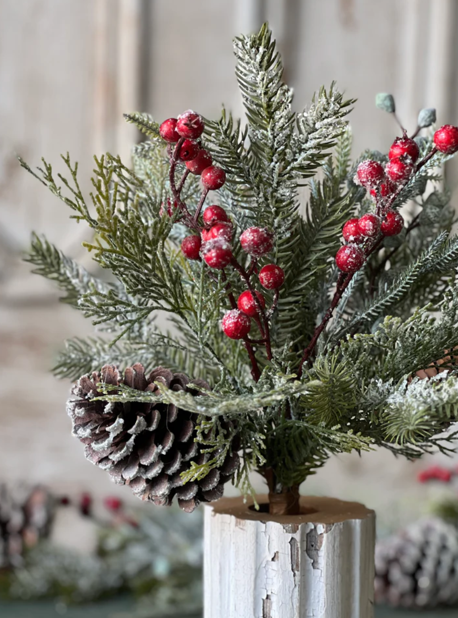 The Tennison Pine is sure to become a new favorite with its snowy mixed greenery, red berries and snow clad pine cones!  A wintery mix that delivers all of the seasons favorites!