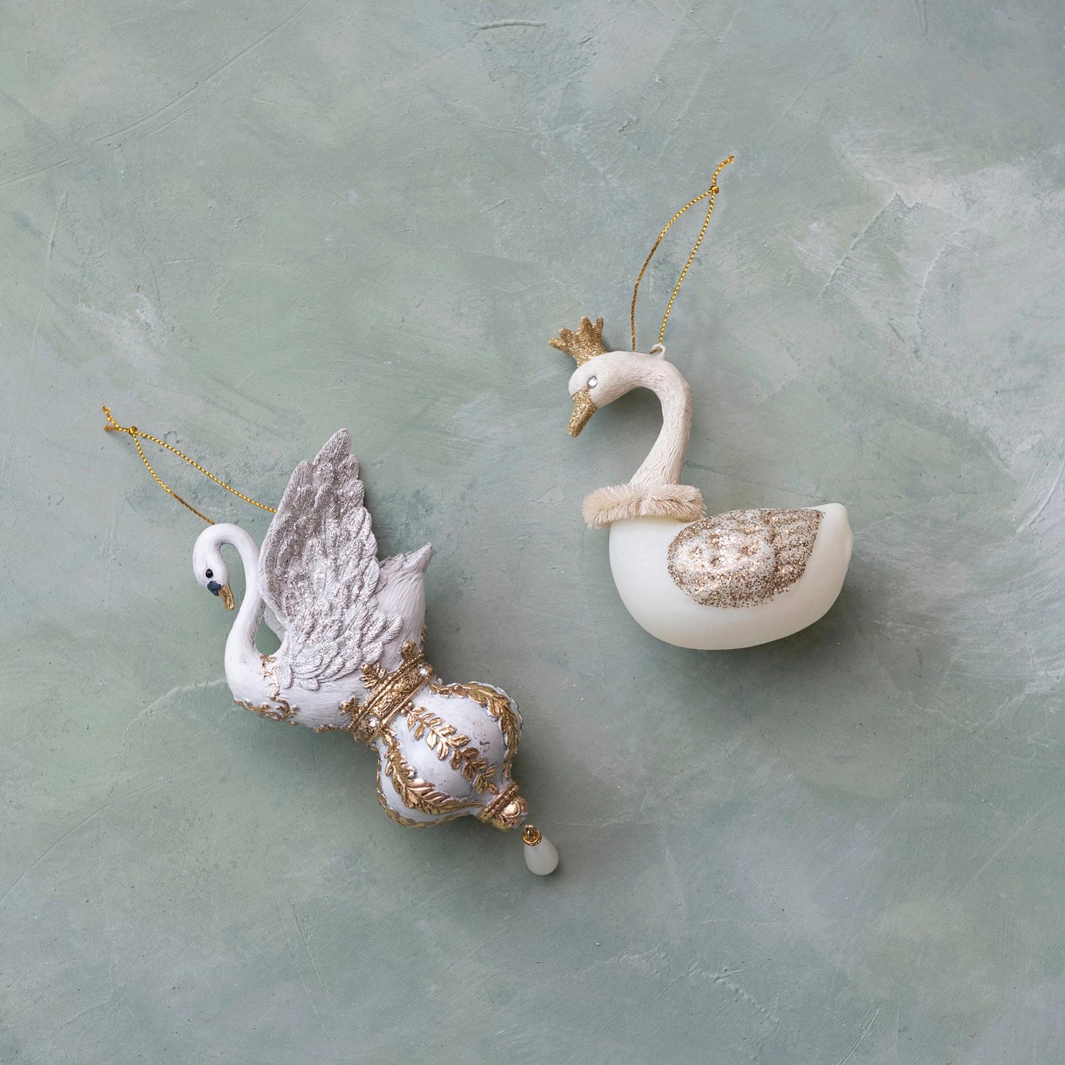 Glass swan ornament with glitter, crown, and sisal wreath. 4-1/4"H
