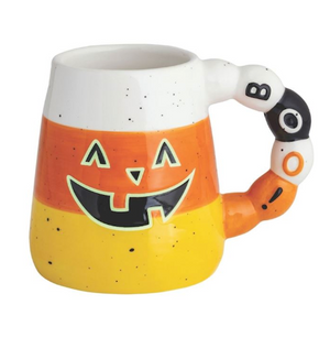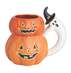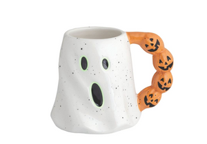 Ceramic mug features glow-in-the-dark facial features and hand-painted handle. 13 oz