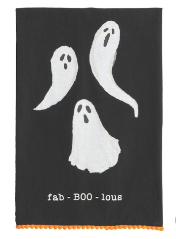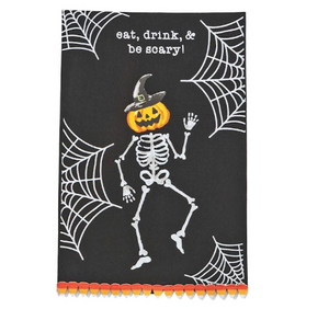 Flour sack hand towel features candy corn icon or mini pom trim. Each sold separately .