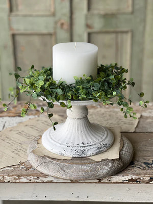 A pedestal plate featuring a distressed finish and pretty fluting at the base that is extremely versatile and easily styled.