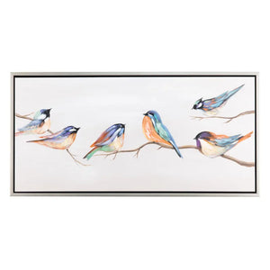 The Crestview Collection Birdie Birds Painted on Canvas with a Silver Frame captures the beauty of the birds as they gather on the sleeping branches to welcome you with their beautiful songs. Who does not love late fall or early spring when the leaves have fallen from the trees, but the birds fill the branches with color? Painted in shades of grey, blue, green, orange, and brown, this painting will subtly bring color and life into your transitional style home or office decor.