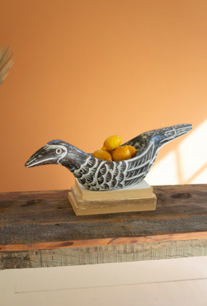 Bird is the word. Use this carved bird bowl as a planter or display bowl on a bookshelf or keep trinkets together on your desk. Black with white detail, this bowl makes a great gift to a hunter or bird watcher.