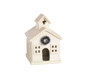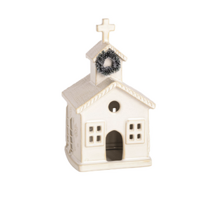 Milk glazed stoneware church sitter features bottle brush wreath or tree detail and pierced openings for light to shine through. Place over flameless tea light to light it up!