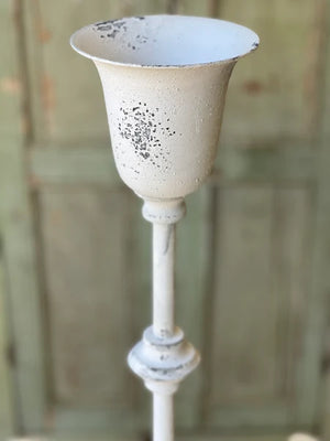 Tall and graceful, this flora holder boasts a beautiful silhouette.  Its distressed finish makes it a beautiful addition to displays and vignettes.