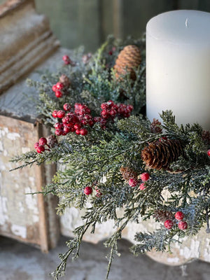 Glittering mixed greenery dashed with snow, berry clusters and peppered with pine cones.