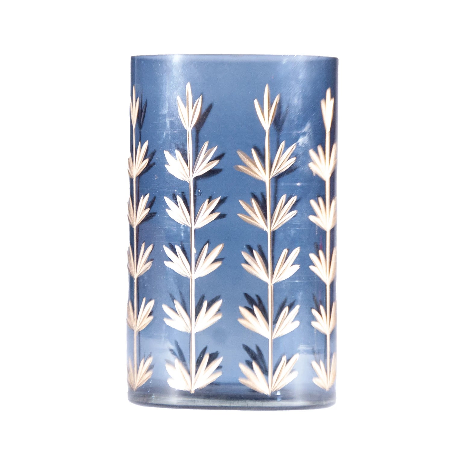 4" Round x 6-1/2"H Hand-Painted Cut Glass Candle Holder/Vase w/ Botanical Design, Navy Color & Gold Finish