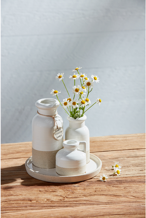 This vase set comprises three bud vases crafted from glazed and gritty textured stoneware. These vases come with a matching tray, adding both style and convenience to your home decor.