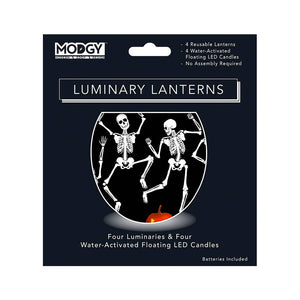 Modgy Luminary Lanterns set the mood in any space with the addition of water and water activated, floating LED candles. These durable, plastic luminaries feature beautiful designs, suitable for indoor and outdoor use. RattleNShake Danse macabre, or skeletons dancing, is a theme originating in medieval times. Part allegory and part satire, the often humorous depictions showed skeletons dancing and mocking the wealthy, implying that despite riches, one cannot escape the inevitable. In 1875 Camille Saint-Saëns composed the Danse Macabre symphony, based upon a French legend of skeletons rising on Halloween for a graveyard dance party. Similarly, Disney created an animated short called The Skeleton Dance in 1929. In it, skeletons dance and play instruments made from their own bones. Our skeletons are dancing and enjoying Halloween, join them and rattle around in your bones! Weight 4.6oz Size 6" X 6.5" BPA free plastic Includes 4 luminaries & 4 LED candles with batteries