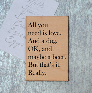 Wood kitchen magnet with "All You Need Is Love And A Dog. OK, And Maybe A Beer. But That's It. Really".