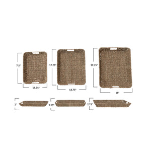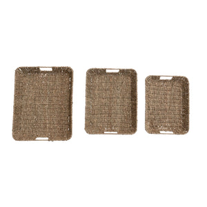 Natural hand-woven seagrass and metal decorative trays with handles. 3 Sizes available (each sold separately).