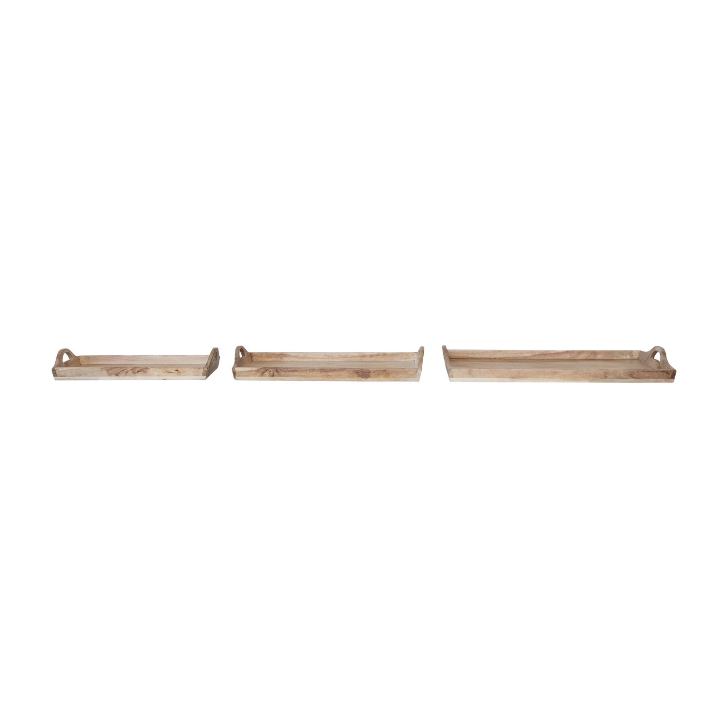 A wonderful way to add charm and convenience to the home, these trays are made of acacia wood bleached to create a light, airy look that complements any farmhouse, French country, coastal, lodge, or cottage core style home. The trays are rectangular-shaped, ideal for serving or displaying food, drinks, or other items that suit the home. The trays also have a handle on each side, making it easy to carry and serve.
