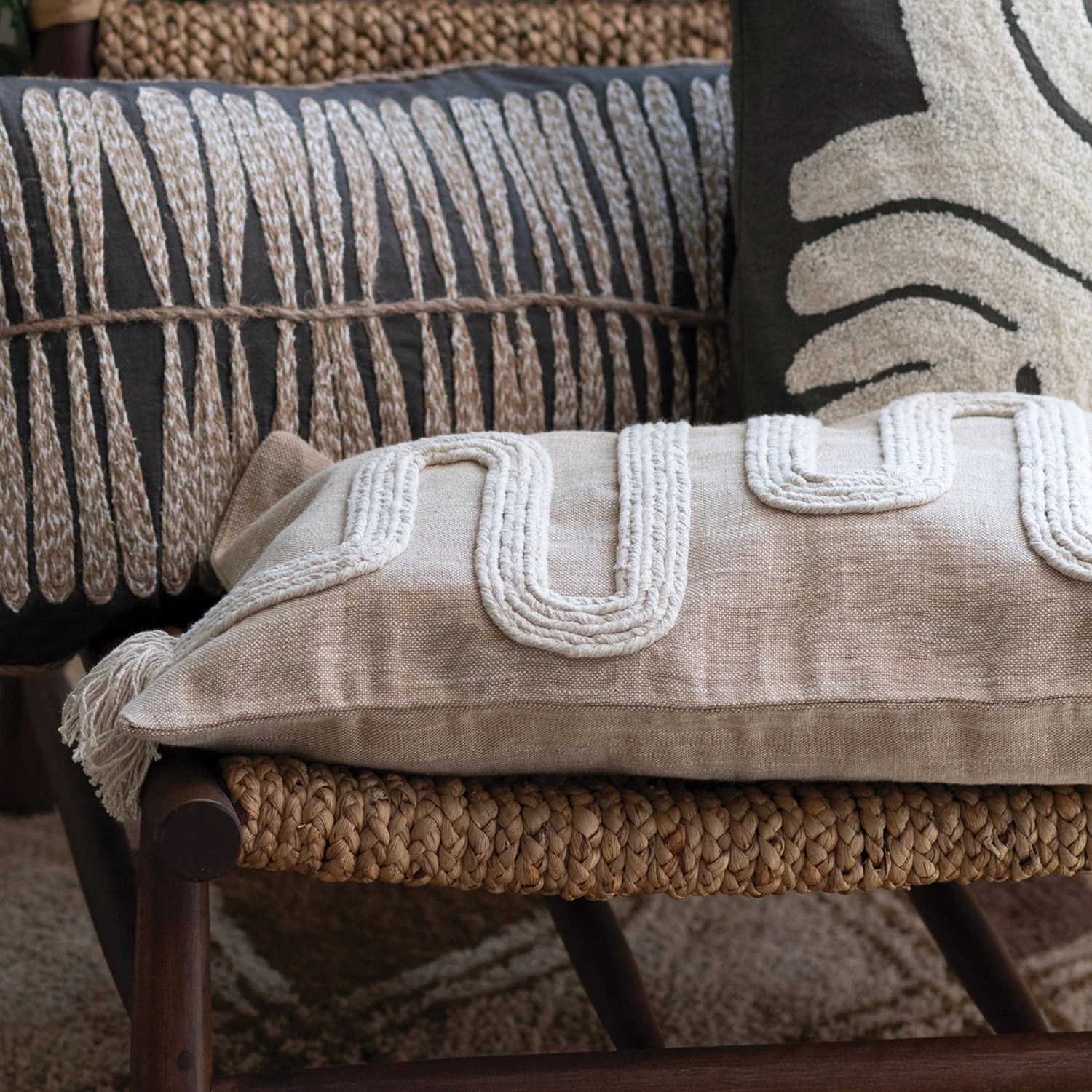 Tan Embroidered Cotton & Jute Lumbar Pillow with Fringe