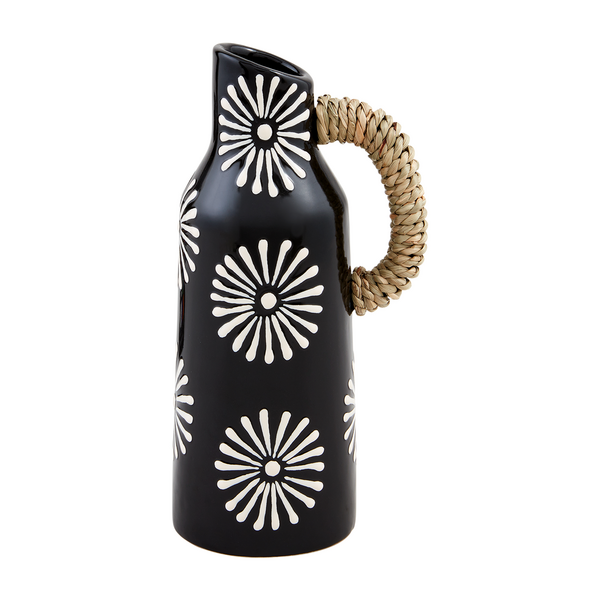 Black with White Floral Pattern Ceramic Pitcher Style Bud Vase