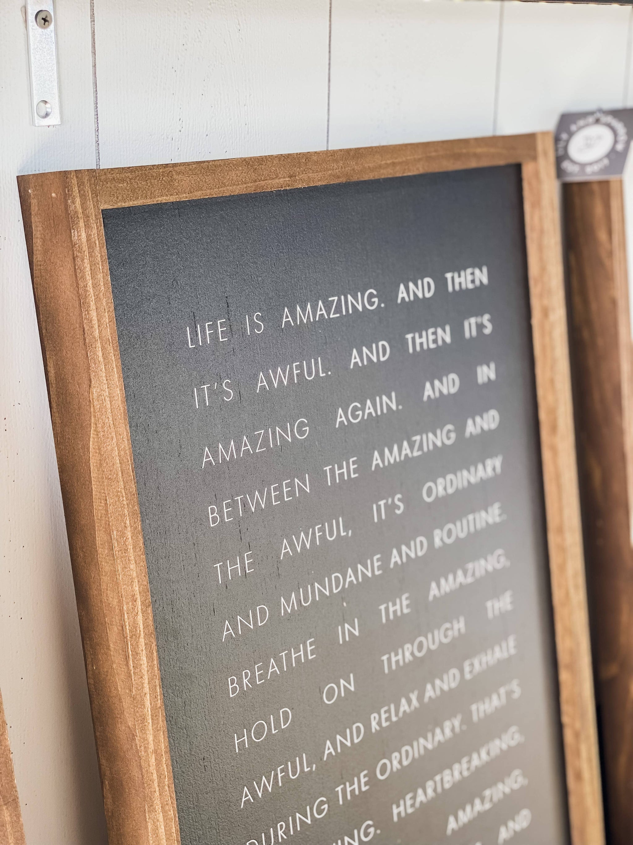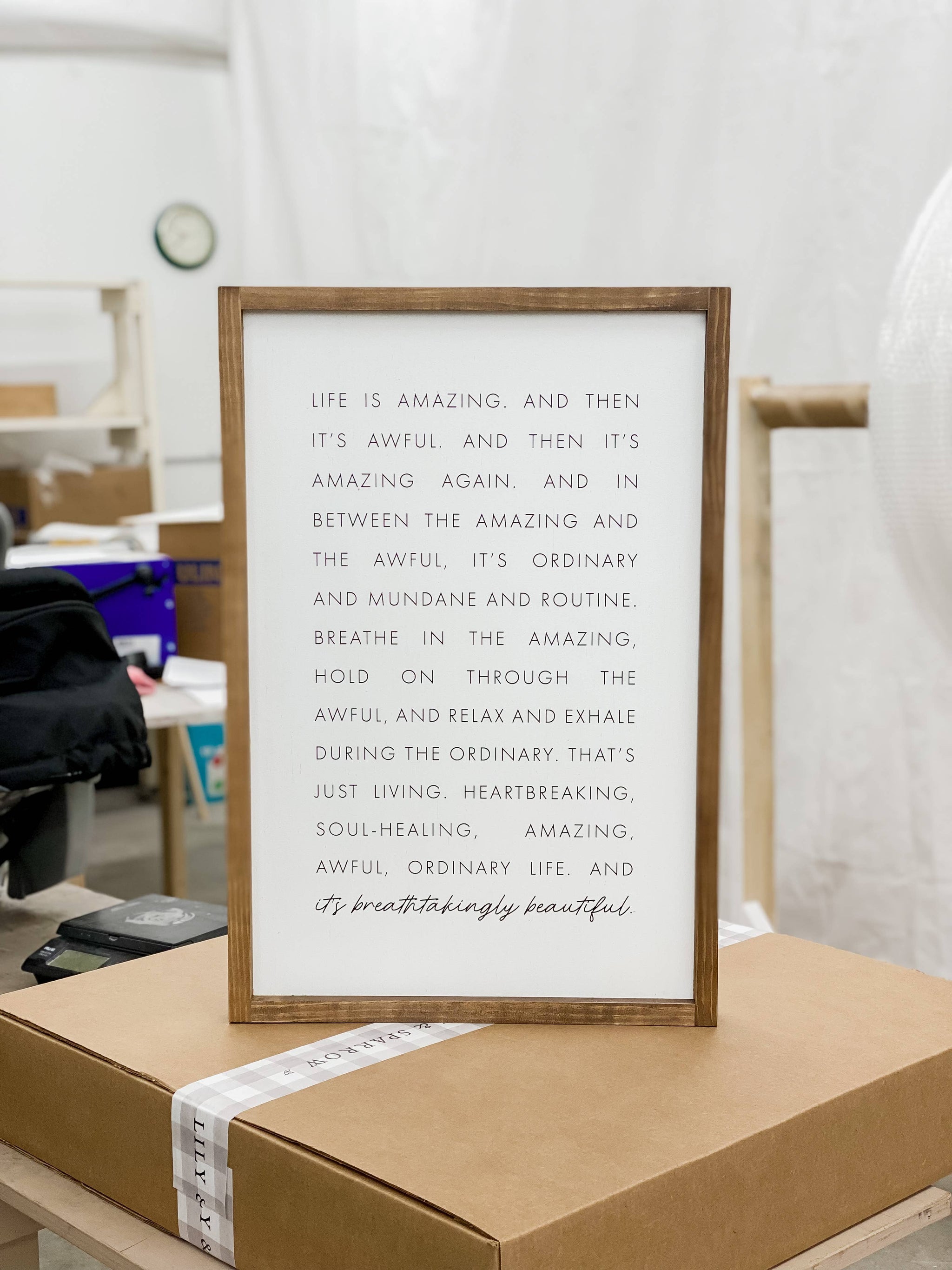 SIZE: approx. 8x12", 13x17", or 17x25" {may vary within a half inch} BACKGROUND COLOR: white, black or dark walnut stain FRAME COLOR: light oak or dark walnut BACK: unfinished, natural birch; Lily & Sparrow stamped logo OTHER: hanging hardware not included; intended to be hung from frame Our wall art and home decor is handcrafted in our workshop in Wisconsin. Since our wall decor is handmade, it can vary slightly and no two wood signs will be alike. This is what makes our signs unique — they're truly one of a kind. Thanks for supporting our family-owned small business!