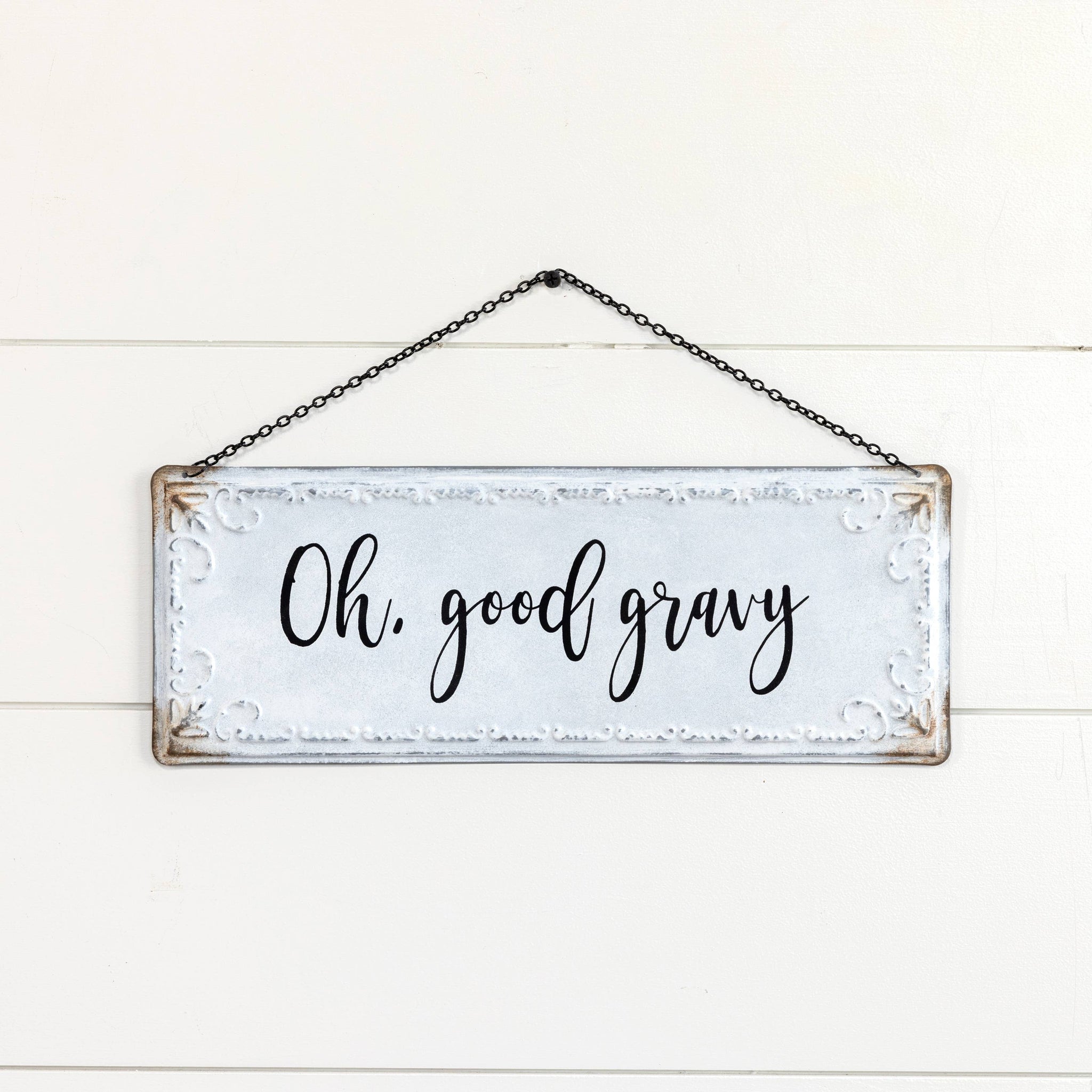 The 'Oh, Good Gravy' sign from Ragon House is a delightful addition to any home. With a hang height of 8.75" chain and a 14" depth, this sign is perfect for enhancing your home accents. Inspired by antique shows, flea markets, and historical pieces, this sign embodies the passion and creativity that has driven Ragon House for over 25 years.