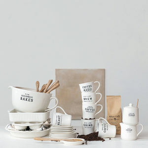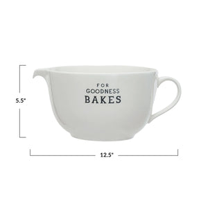 This "For Goodness Bakes" Batter Bowl is a delightful addition to any baker's collection. Measuring 12.5" long and 5.5" high, its oval shape and generous size make it ideal for mixing everything from pancake batter to bread dough. Crafted from white stoneware, it's sturdy enough for everyday use yet stylish enough to fit into eclectic, farmhouse, or French country-themed kitchens. Whether whisking up a storm or simply displaying it on the counter-top, this batter bowl infuses charm and functionality into the culinary space. With its classic design and practical features, this batter bowl is sure to become a favorite tool in the kitchen.