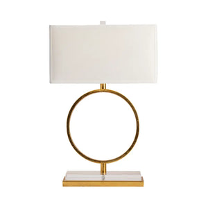 The Crestview Collection Aldrich Table Lamp brings a touch of transitional modern to your home. The base features a layer of crystal sitting atop a layer of gold-finished metal. A large, gold circle sits as the body. A white, rectangular shade adds a sharp contrast to the round body.