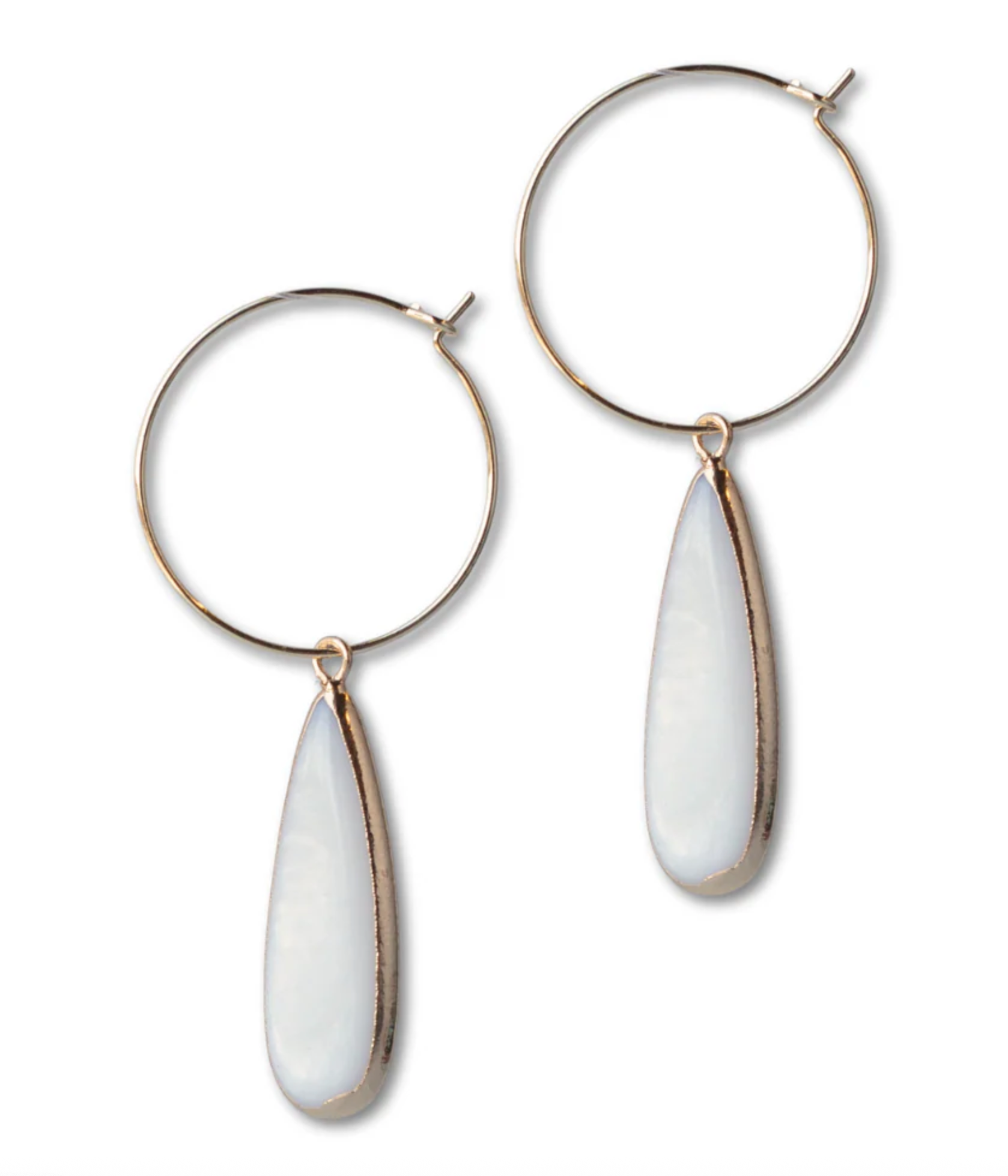 The Intentions Collection earrings feature a simple 12k gold plated hoop, paired with shimmering mother of pearl drops.