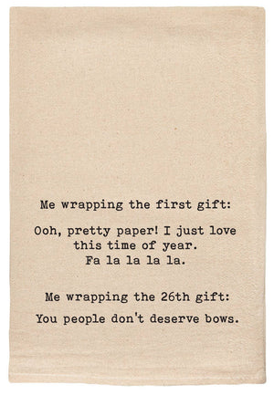 Crafted in the USA from 100% unbleached cotton, these natural kitchen towels measure about 24" x 26" when unfolded. Each towel is hand-sewn and printed using eco-friendly, water-based ink that is gentle on both fabric and the environment. Durable and easy to care for, they are machine washable and dryer safe. Perfect as a thoughtful hostess gift paired with wine, or as a humorous addition to a stocking or white elephant exchange.