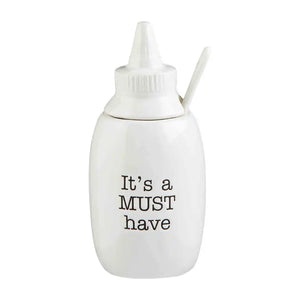 These ceramic condiment holders are a must have for your backyard barbeque. Each condiment bottle shaped container comes with a lid and a spoon.