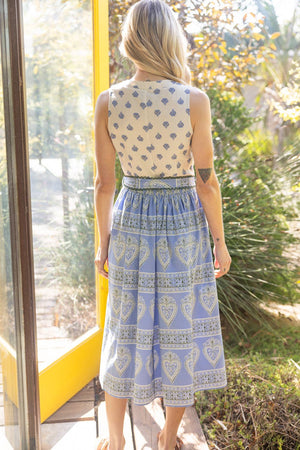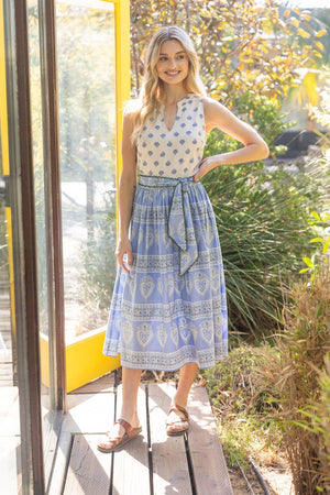 • V neckline • Sleeveless • Contrast edge lace detailed waist tie • Center back invisible zipper closure • Mixed print cotton fabric midi dress • Size information: Model height 5' 8”, wearing size Small